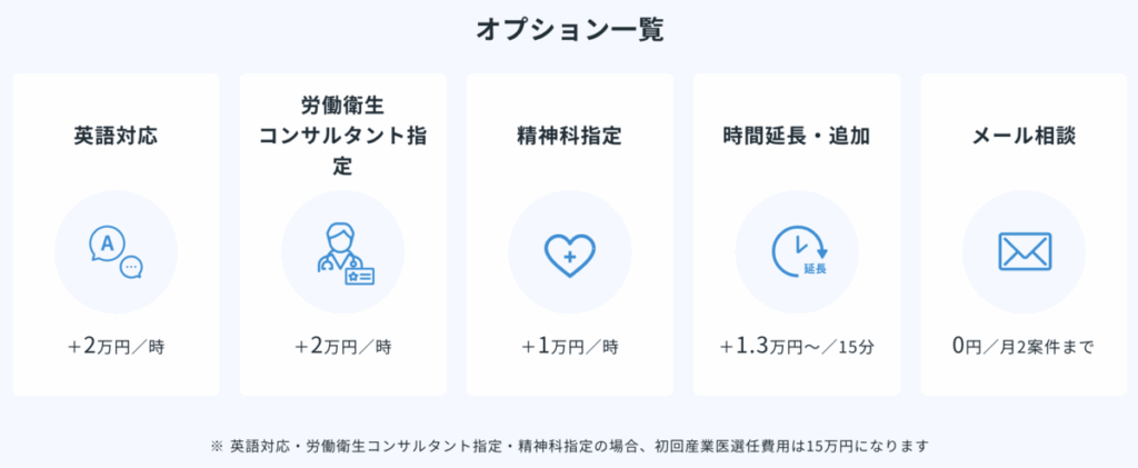 なお、産業医紹介サービスの「Carely産業医紹介」を利用する場合、オプションの費用感は下記のとおりです。
