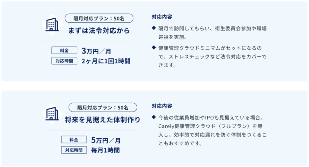 例えば、「Carely産業医紹介」では、ストレスチェック、面談記録、衛生委員会議事録管理などの産業保健業務に必要な機能を網羅した「健康管理クラウド」が無料セットになっています。