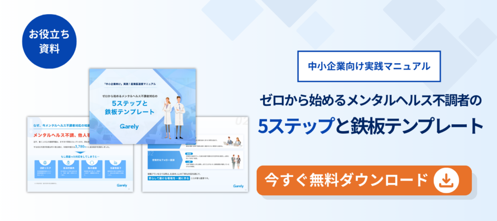 万が一メンタルヘルス不調者が出た場合、対応手順に不安がある人事担当者もいるのではないでしょうか。当サイトでは、産業医と連携して行うべき「メンタルヘルス不調者対応マニュアル」を配布しています。